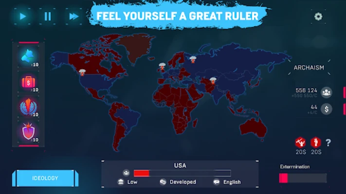 The game features 8 fictional political ideologies: Communism, Capitalism, Imperialism, Anarchy, Libertarianism, Ecologism, Militarism, Pacifism. Each ideology has unique upgrades, game mechanics, and expansion features.