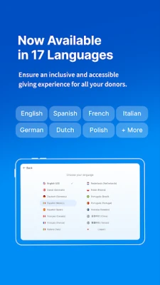 - Reach more donors with additional languages. With 17 languages supported, you can connect with donors from all over, making in-person giving more inclusive and accessible.